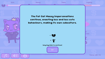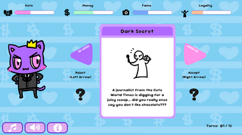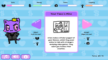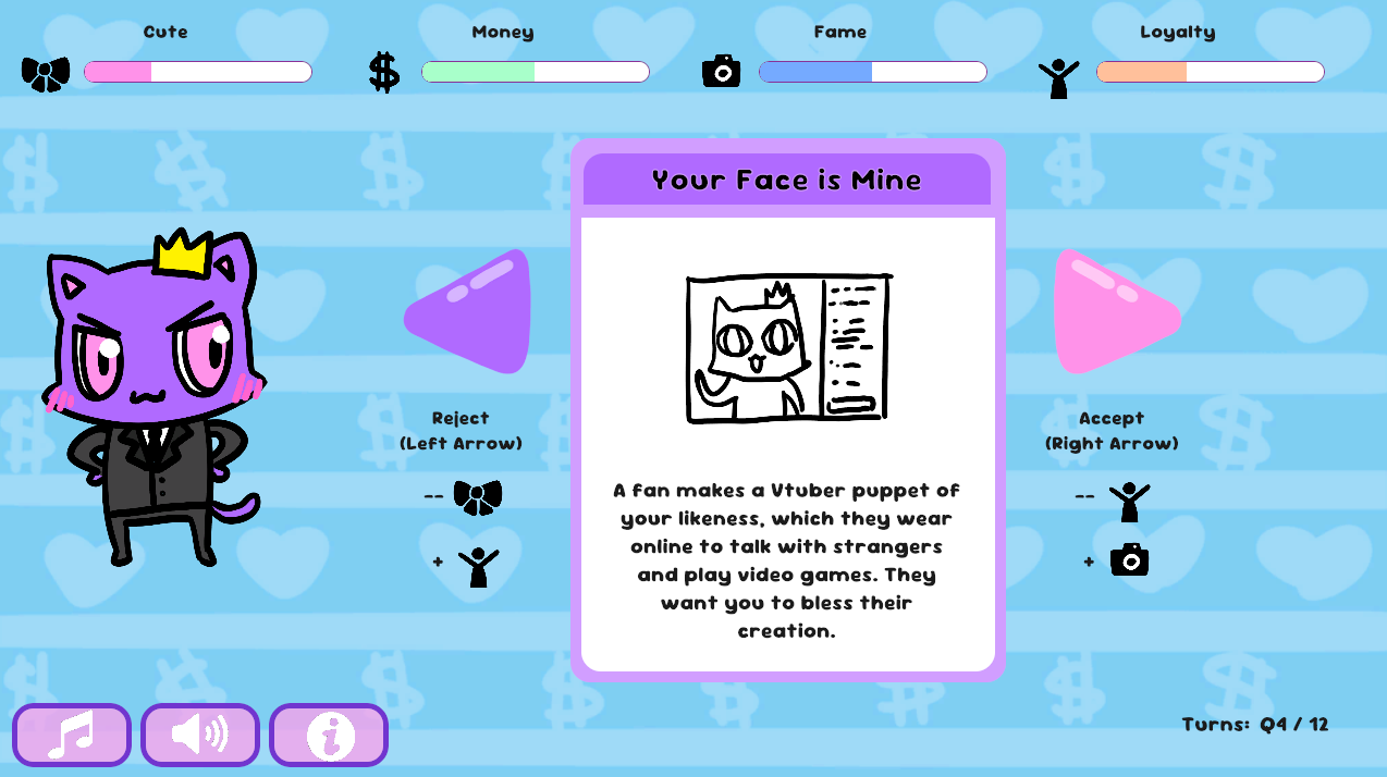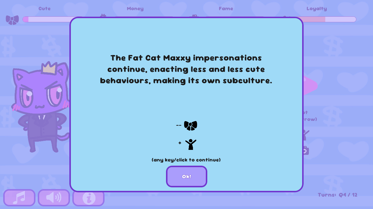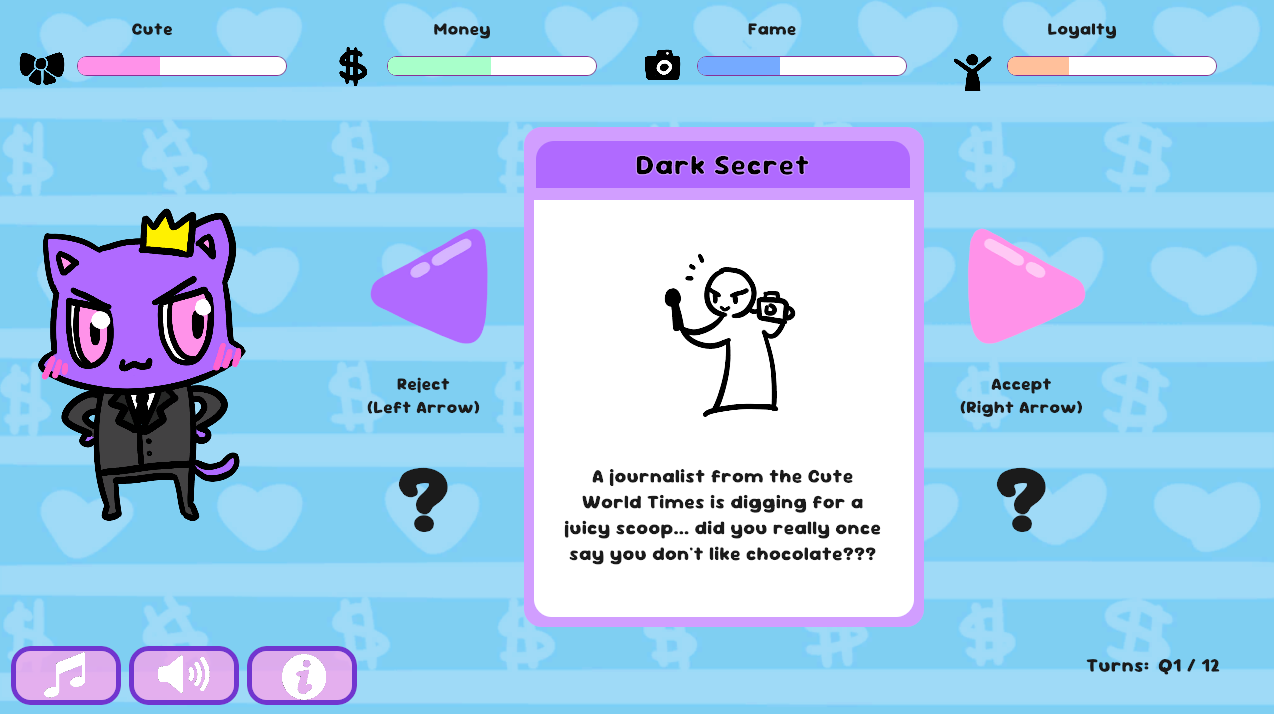 Good morning, your highness! You were born naturally Cute, but can you grow your Money, Fame, and Loyalty without going overboard? You have to survive 3 years (12 quarters) but if you do, your brand legacy is assured! Right?!